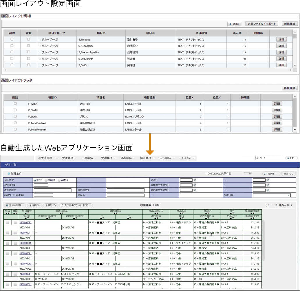 発注側(小売)では、取引先向け画面や状況照会画面の表示項目を自社仕様にあわせて設定が可能です。流通BMSのデータ項目をベースにメッセージ単位に一覧や詳細画面の表示項目を、ヘッダー部、詳細部、フッター部に分けて設定できます。